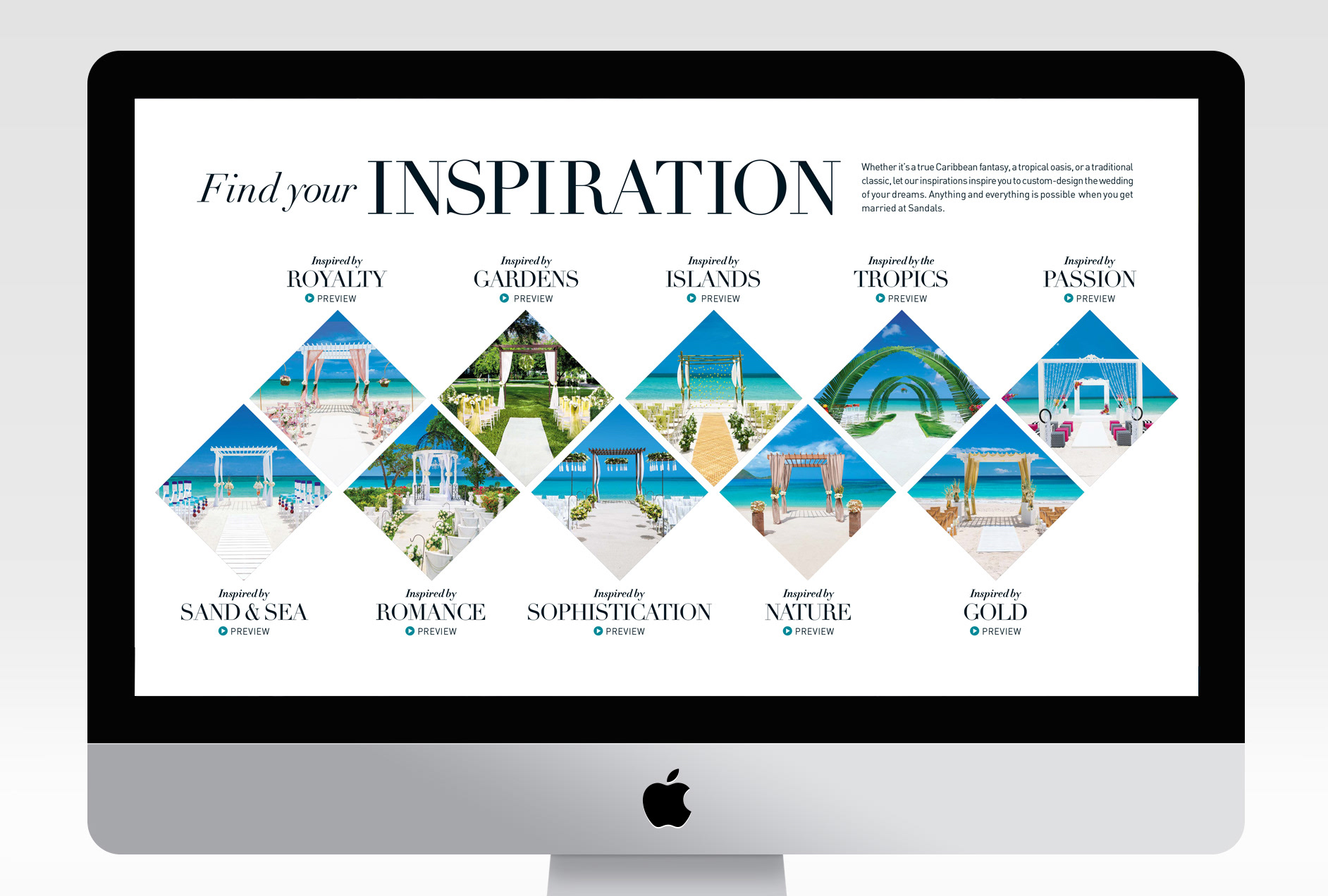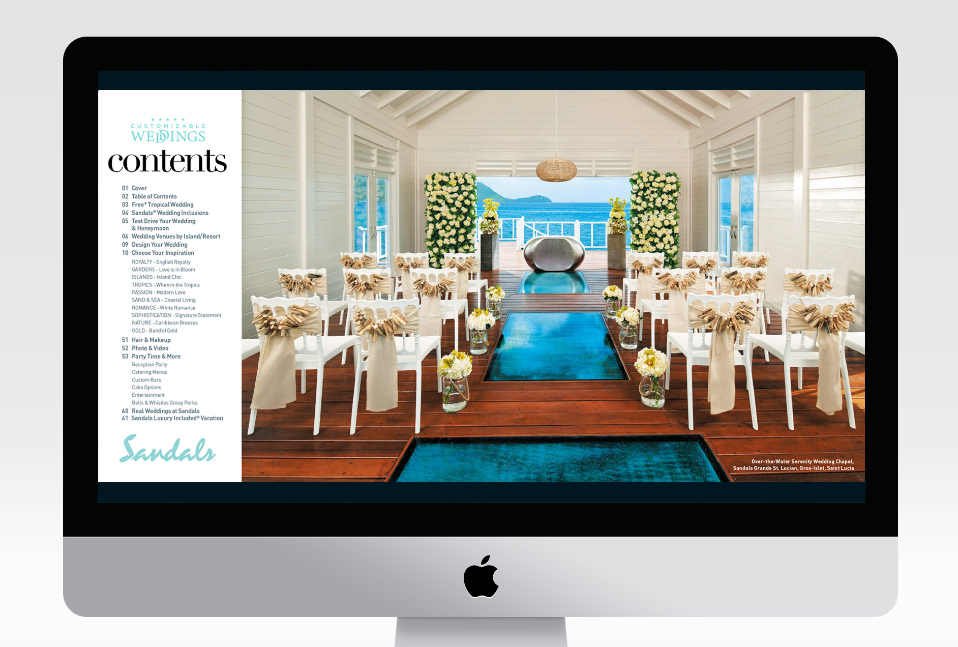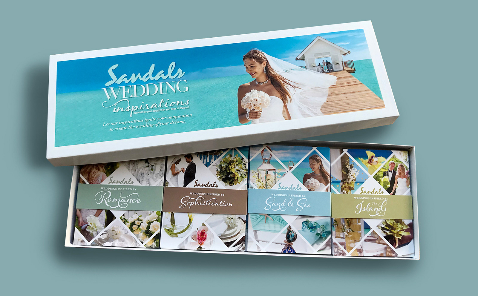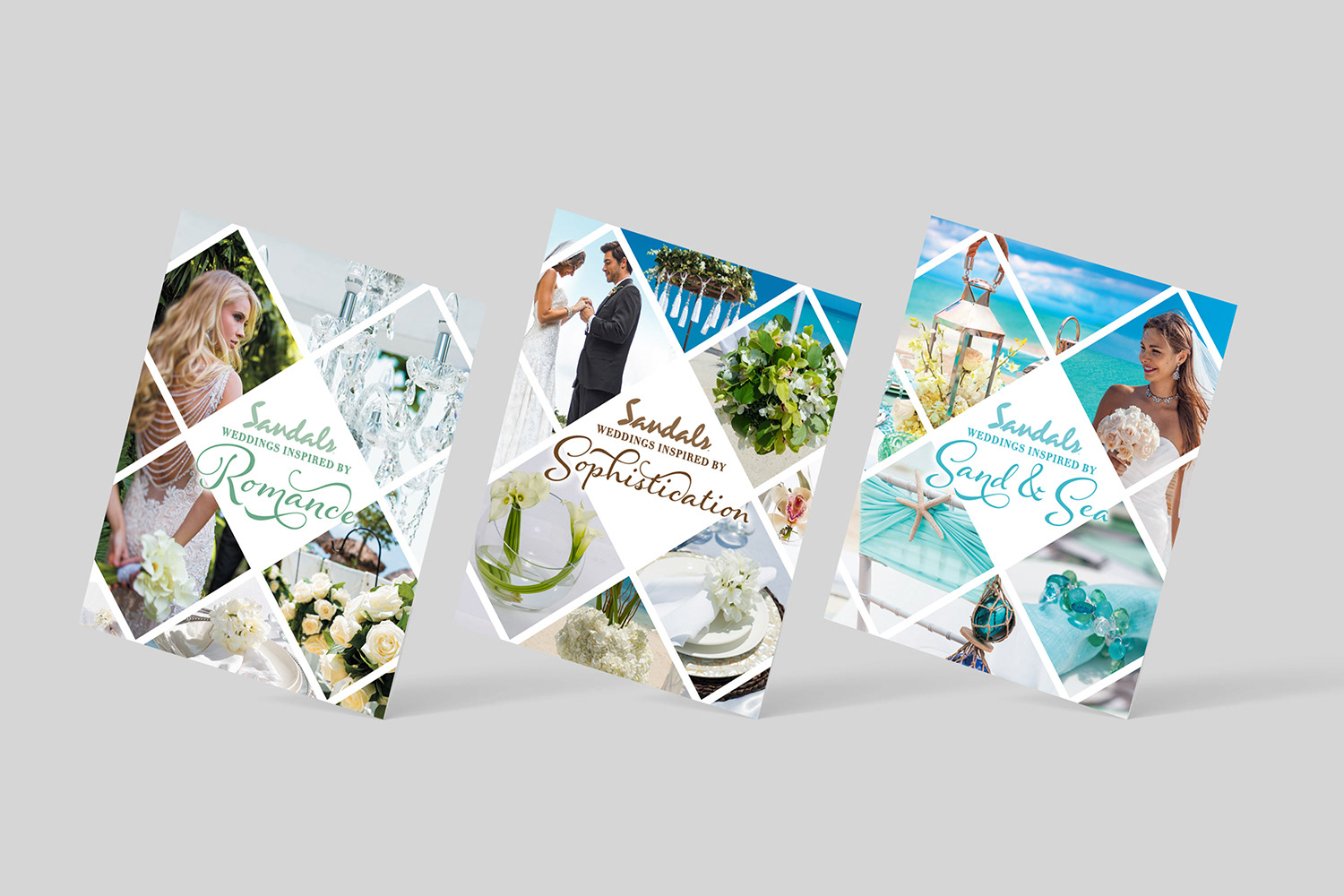 Marketing materials for Sandals Resorts customizable weddings includes an online catalog, printed brochure and product cards.
