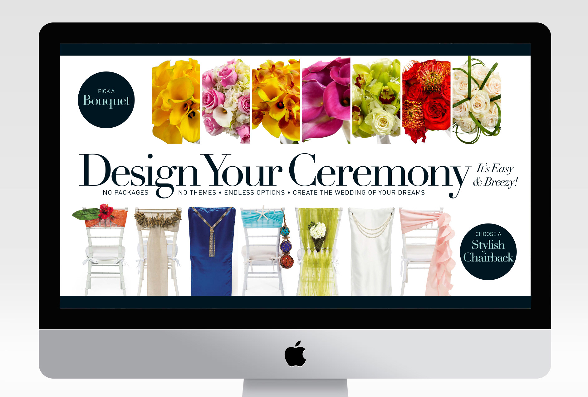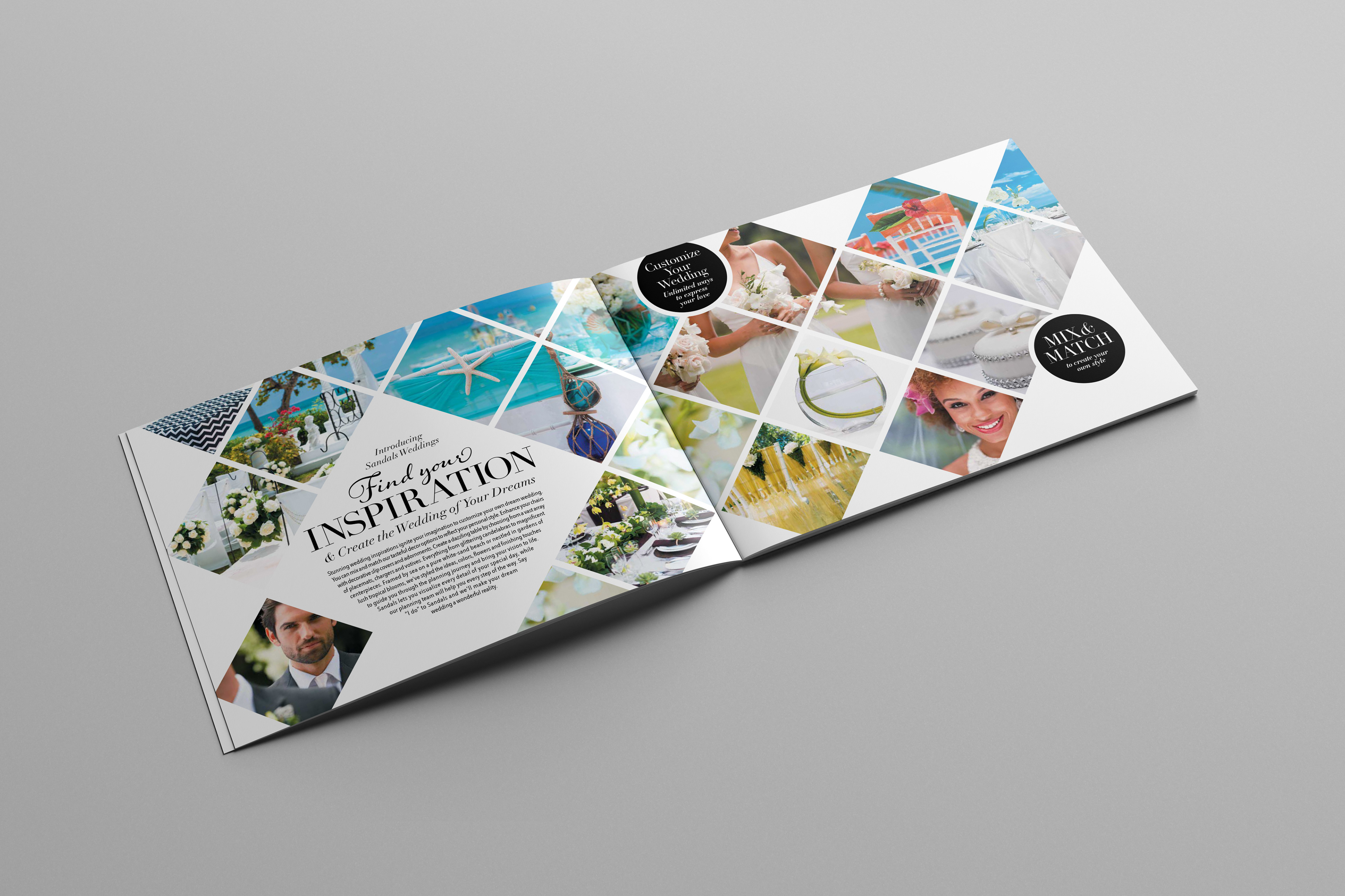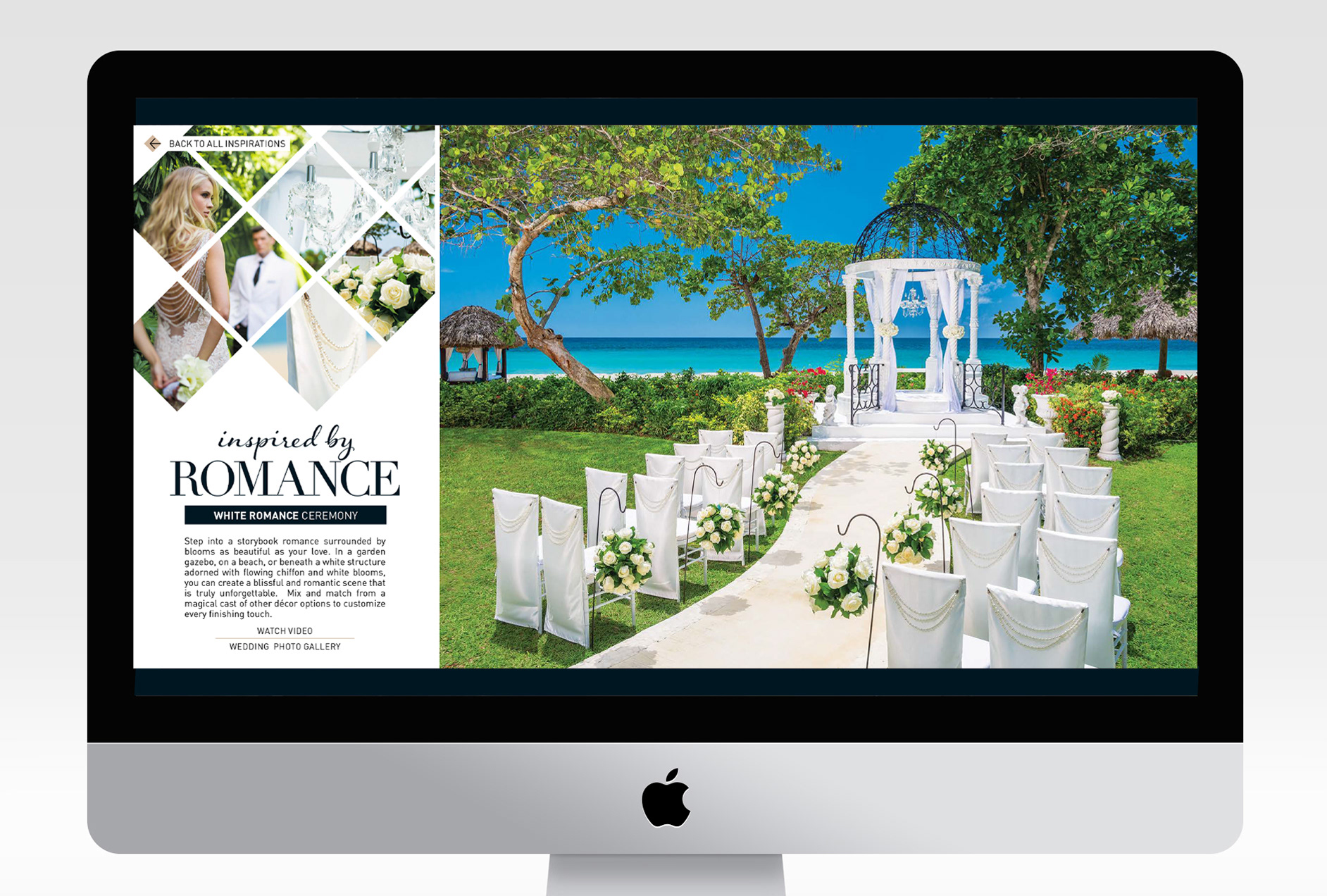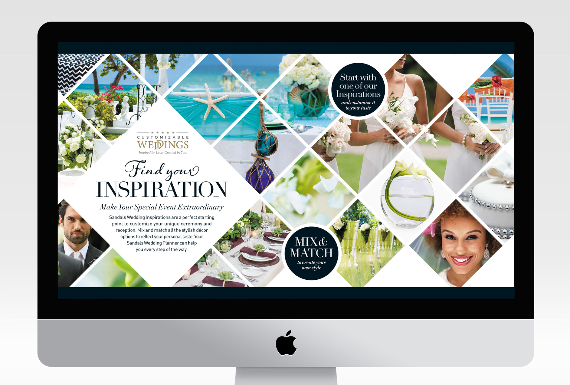 Marketing materials for Sandals Resorts customizable weddings includes an online catalog, printed brochure and product cards.