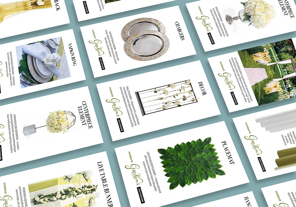 To bring the Wedding Inspirations collection to life and highlight its flexibility and design range, I conceptualized themed card decks that captured the full décor story behind each theme. The cards let brides mix and match décor elements across styles to create a look that felt uniquely their own, with product details featured on the back.