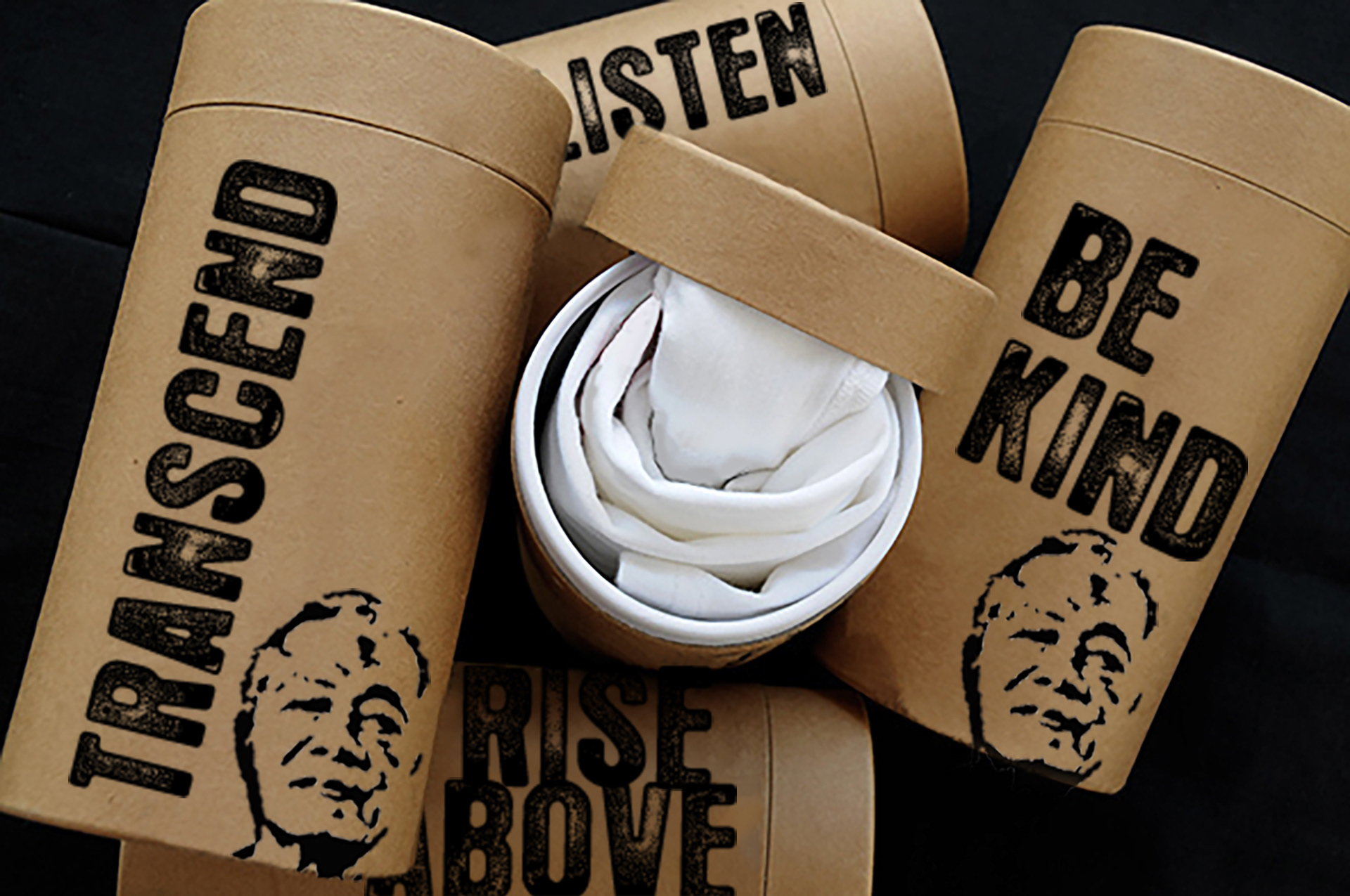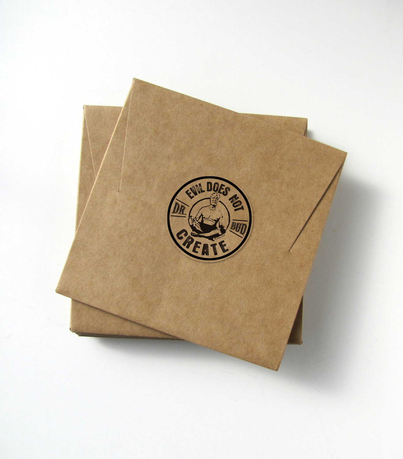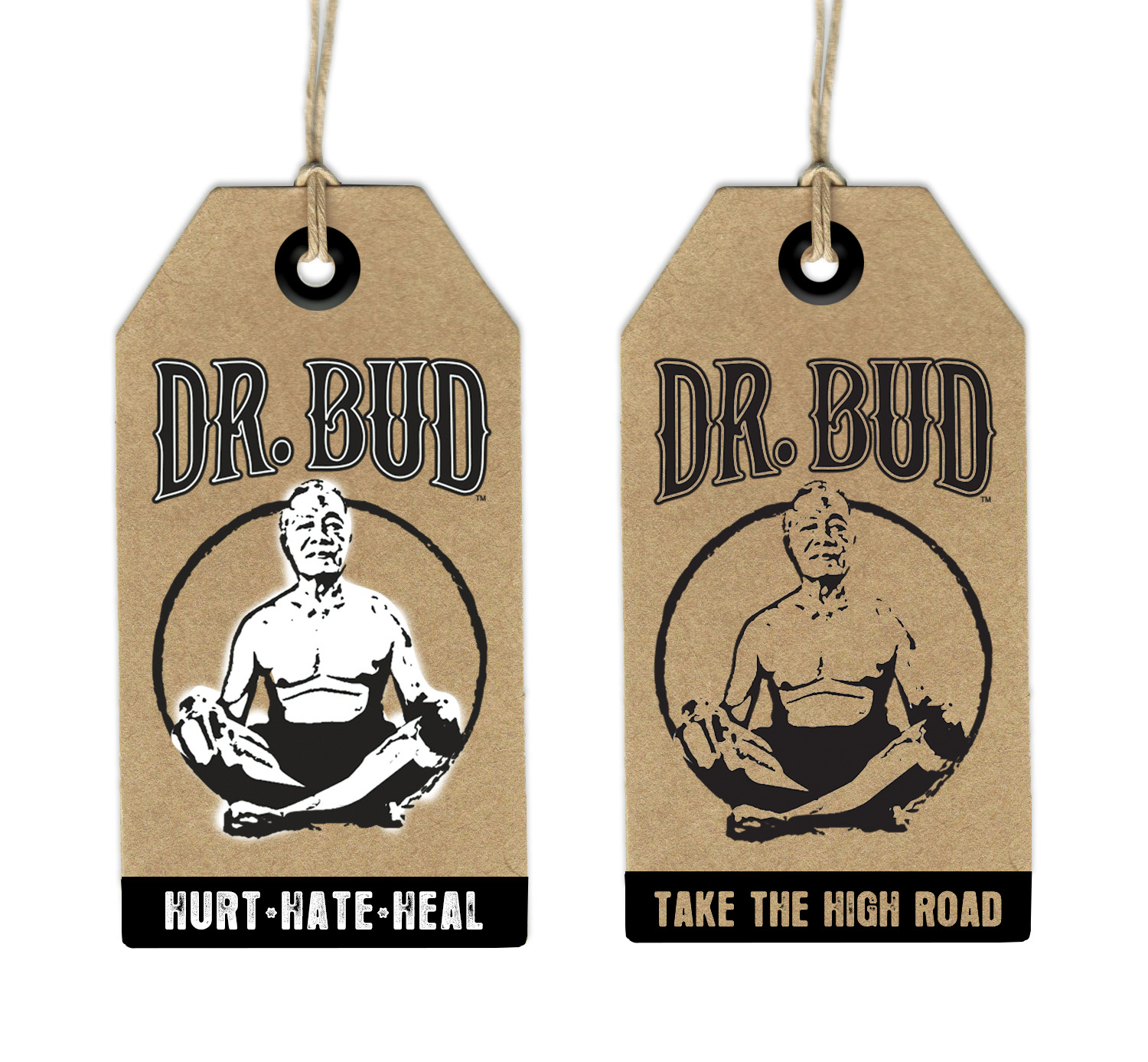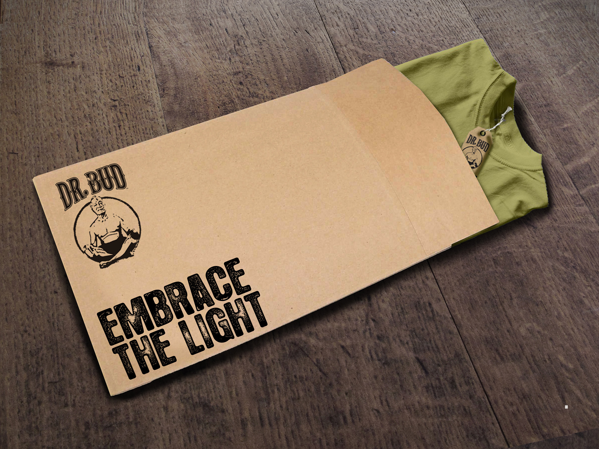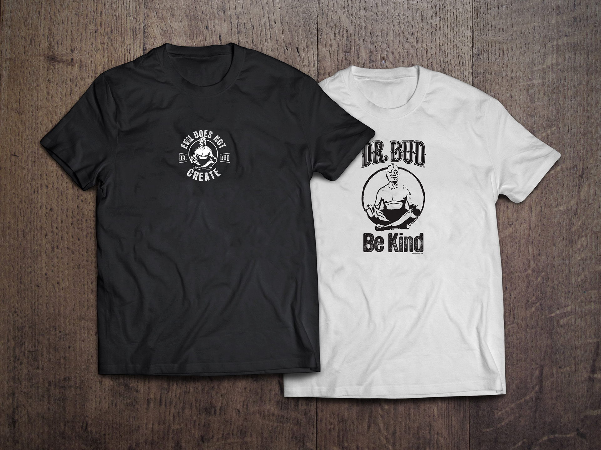 Dr. Bud is an ongoing creative art project and media campaign celebrating the healing capacity of kindness and the power of positivity. Brand creation included artwork and logo development. Street art components included murals, stickers, stencils, posters and t-shirts featuring the likeness of Dr. Bud and highlighting his teachings (‘Bud-isms’) including ‘Evil Does Not Create,’ ‘Freedom From Fear,’ ‘Be Kind,’ and other messages of enlightenment. I explored an unpretentious, no-fuss, simplistic approach to the T-shirt packaging, choosing kraft materials to reinforce the brand’s down-to-earth nature.
