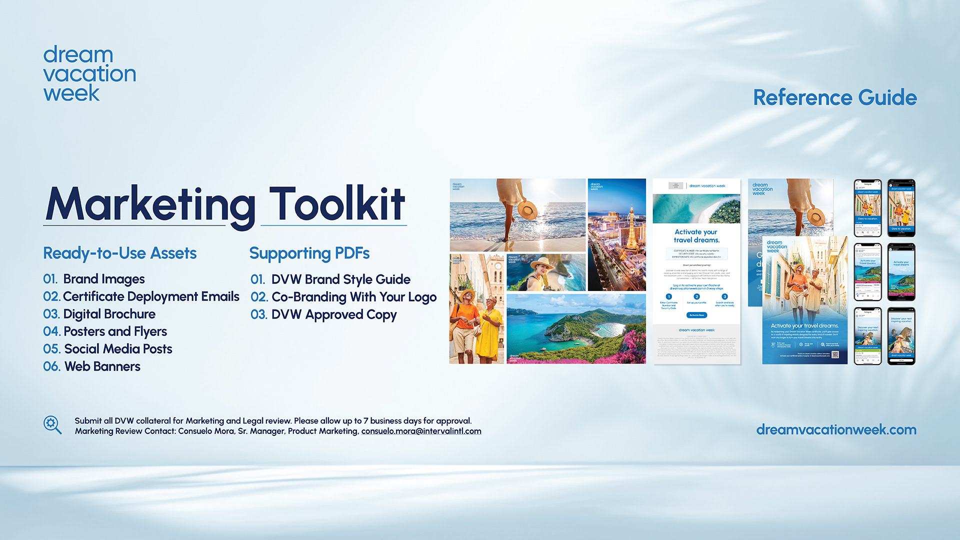 The Dream Vacation Week marketing toolkit includes a brochure, digital certificates, downloadable ready-to-use posters and flyers, brand photography downloads, style guide, sales and promotional web banners and email templates.